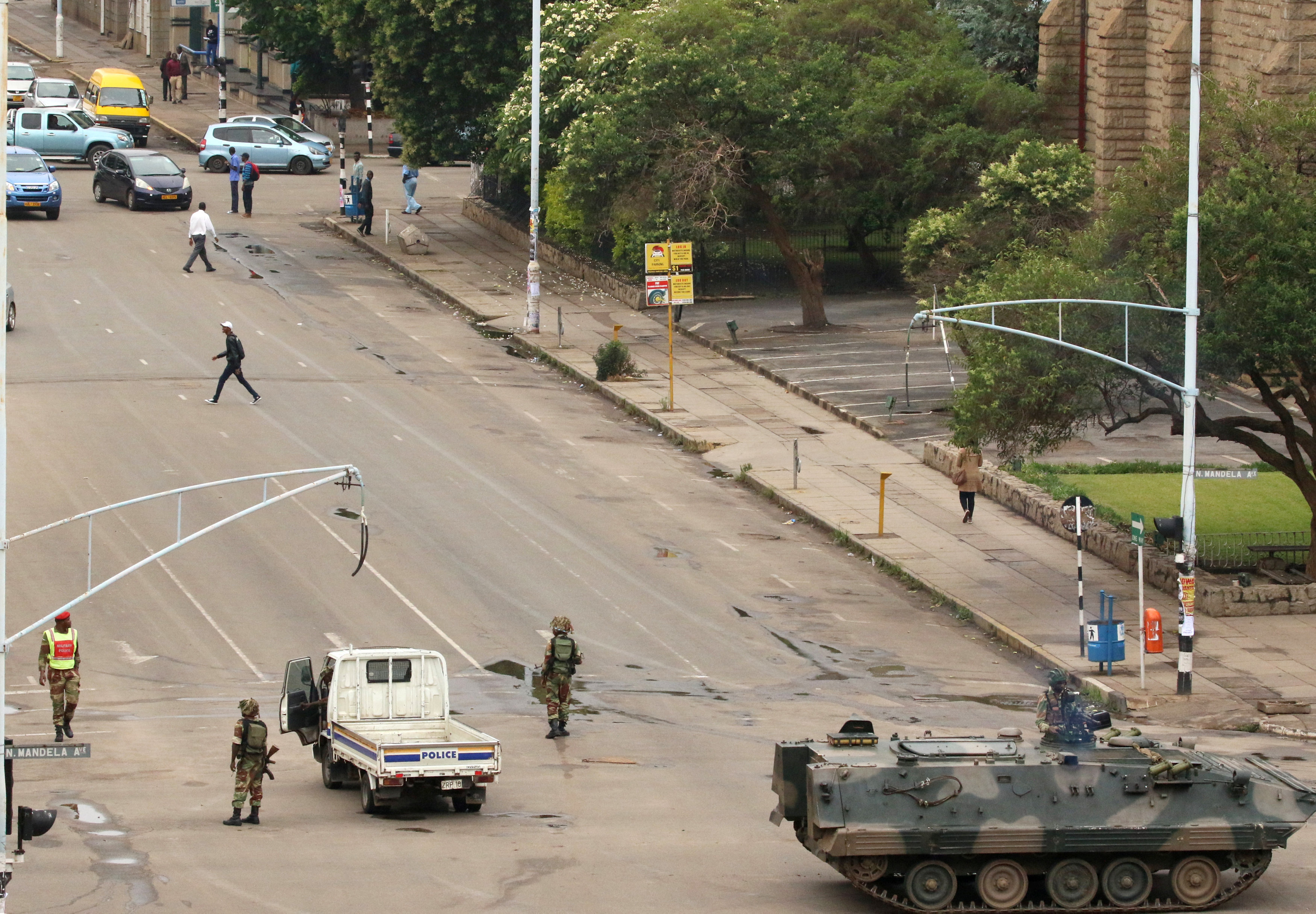 Эммерсон Мнангагва бежал, полиция начала аресты его сторонников, но тут вмешалась армия, в рядах которой на командных должностях по-прежнему служит огромное количество "старых бойцов". 14 ноября в Хараре вошла военная техника, в центре города прозвучали взрывы и стрельба, а казармы "5-й парашютной бригады", не сумевшей или не пожелавшей защищать своего президента в равном бою с хорошо вооруженным противником, оказались полностью окруженными и блокированными. Полиция и службы безопасности, мгновенно оценив ситуацию, теперь стали арестовывать сторонников Роберта и Грейс Мугабе и считавшихся верными им членов правительства.