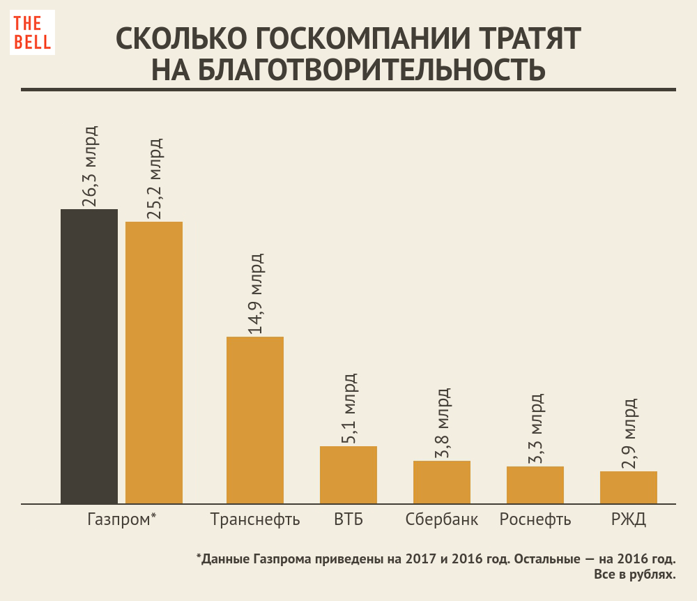 «Газпром» в 2017 году поставит рекорд среди российских компаний по затратам на благотворительность, потратив 26,3 млрд рублей. Рост расходов вызван увеличением финансирования программы «Газпром — детям» и участием компании в проекте создания исторических парков «Россия — Моя история». Вкладывать в благотворительность «Газпрому» не мешают даже убытки — первые 9 месяцев 2017 года, по данным отчетности по РСБУ, компания впервые за 19 лет закончила в минусе, чистый убыток составил 9,3 млрд рублей.