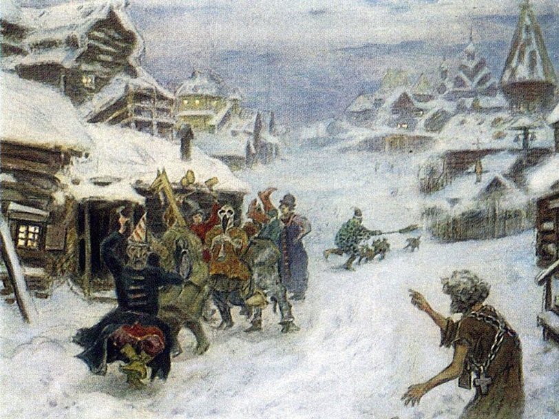 «Начиная с XII в. в церковных поучениях против язычества обличается обычай надевать на себя «личины бесов», «звероподобные» и «дьявольские», т. е. демонические маски… Даже если маской служили такие обычные вещи, как платок, ткань, марля, бумага, закрытое лицо ряженого пугало своей неподвижностью, «чужестью», «слепотой» и воспринималось как знак потустороннего и опасного существа… Народные названия маски и самих ряженых подтверждают их демоническую и потустороннюю природу: ср. рус. названия: чертовы рожи, хари, образины, бесовские личины, пужала, обертихи, шишиги, халявы, умруны, деды и т. п… Согласно русским верованиям, человек, надевший маску, уподобляется черту (владимир.)… В Ярославской губернии большим грехом считалось надевать на себя «хари»; даже для парней ношение маски было «непристойной забавой и настолько тяжким грехом, что провинившемуся остается только один способ очиститься – выкупаться в проруби в день Богоявления»» [14 III: 191‑193].