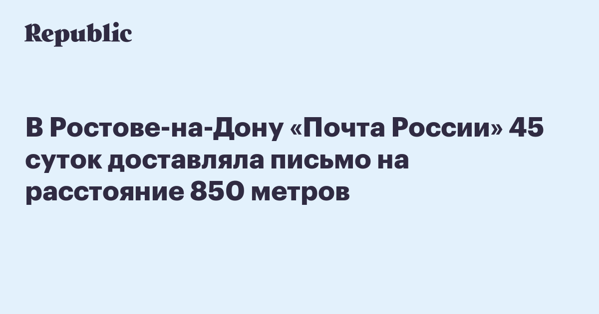 В Ростове-на-Дону отделение «Почты России» в течение 45 суток доставляло собственное письмо в издание RostovGazeta, офис которого расположен в 850 метрах от Главпочтамта. Об этом 15 ноября сообщили в редакции RostovGazeta, внимание на публикацию обратили «Новые известия».