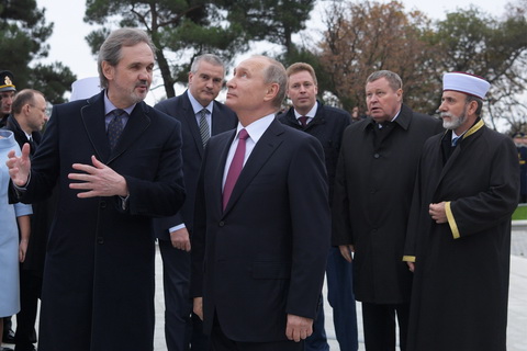 3. Россия. Ялта. 18 ноября 2017. Скульптор, глава Союза художников России Андрей Ковальчук и президент России Владимир Путин (слева направо на первом плане), муфтий мусульман Крыма Эмирали Аблаев, полномочный представитель президента РФ в Южном федеральном округе Владимир Устинов, губернатор Севастополя Дмитрий Овсянников и глава Республики Крым Сергей Аксенов (справа налево на втором плане) во время церемонии открытия памятника императору Александру III в парке Ливадийского дворца. Алексей Дружинин/пресс-служба президента РФ/ТАСС
