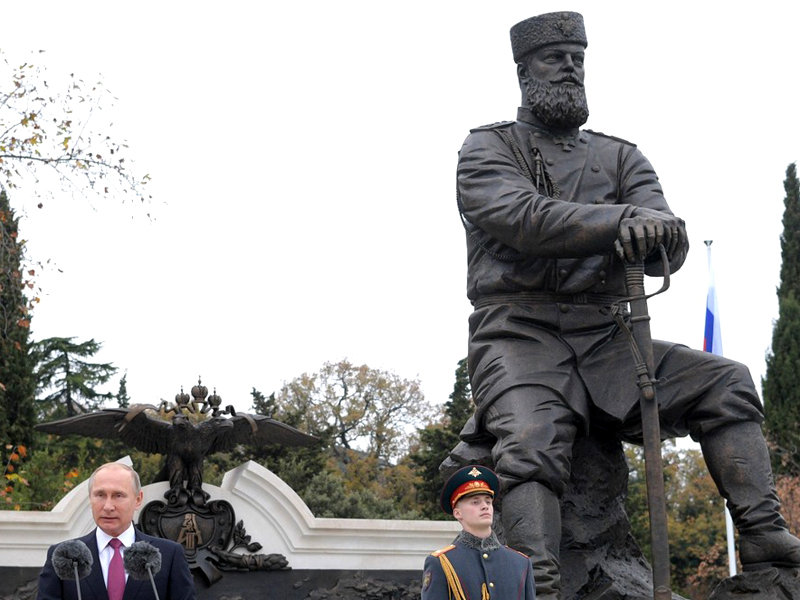 Когда плюгавый Путин стоял рядом с четырехметровым истуканом царя, он, видимо, хотел казаться преемником и наследником империи. Он очень старается, но все время получается пародия. Особенно вот эти слова, сказанные на фоне насквозь лживой стелы: "Движение вперед невозможно без уважения к своей истории, культуре и духовным ценностям..."