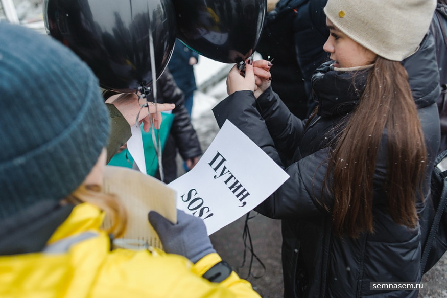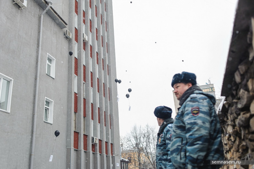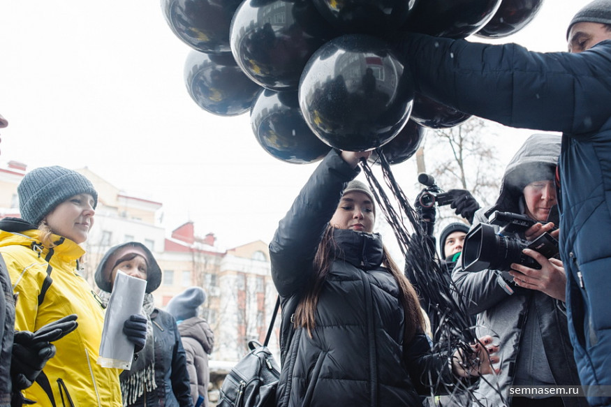 Другие дольщики тем временем доставали из связки черные шарики и раздавали их всем присутствующим. Они закрепляли на них листки бумаги, на которых было написано «Путин, SOS!».