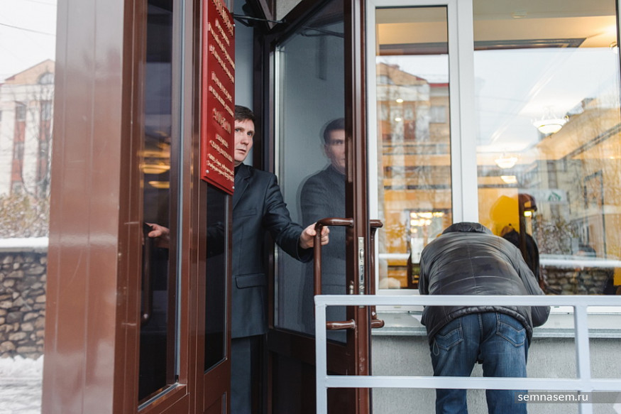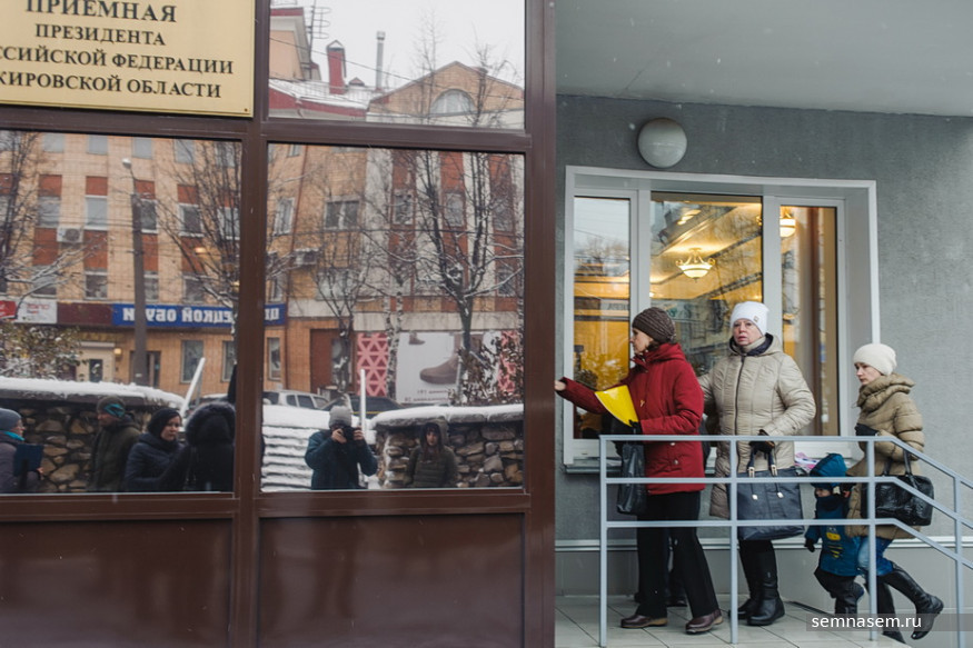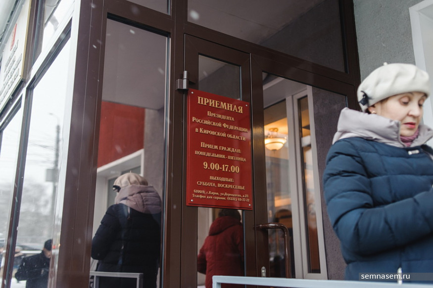 Участники акции по одному заходили в приемную президента. Журналисты «7x7» последовали за одним из дольщиков, но мужчина в строгом костюме, вероятно, охранник, заявил, что без аккредитации снимать происходящее внутри нельзя. Корреспонденты «7x7» попали в помещение после распоряжения представителя государственной федеральной инспекции в Кировской области. Входную дверь в приемную после этого закрыли на ключ.