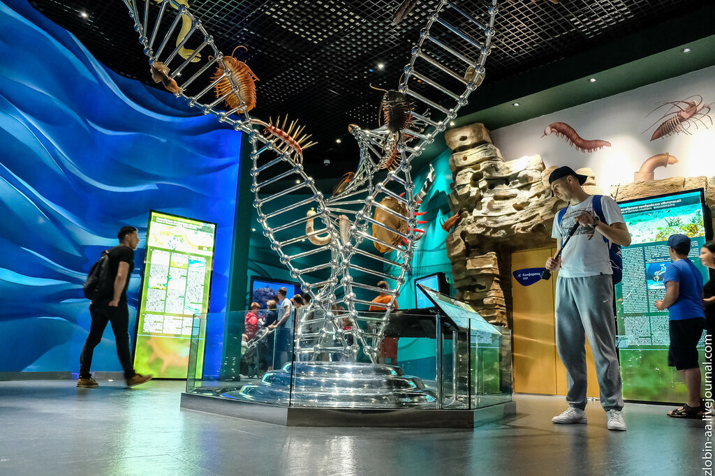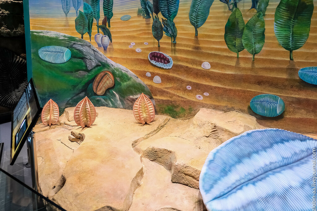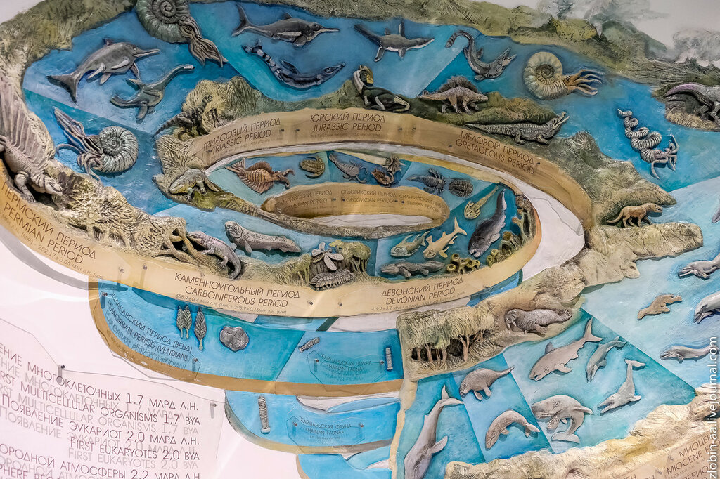 01 - начало экспозиции, как водится, начинается с истории - Тыщщи и мильёны лет назад совсем крохотные штуковины возмужали, отрастили себе лапы, усы, хвосты и превратились в огромные штуковины с зубами и глазами :-)