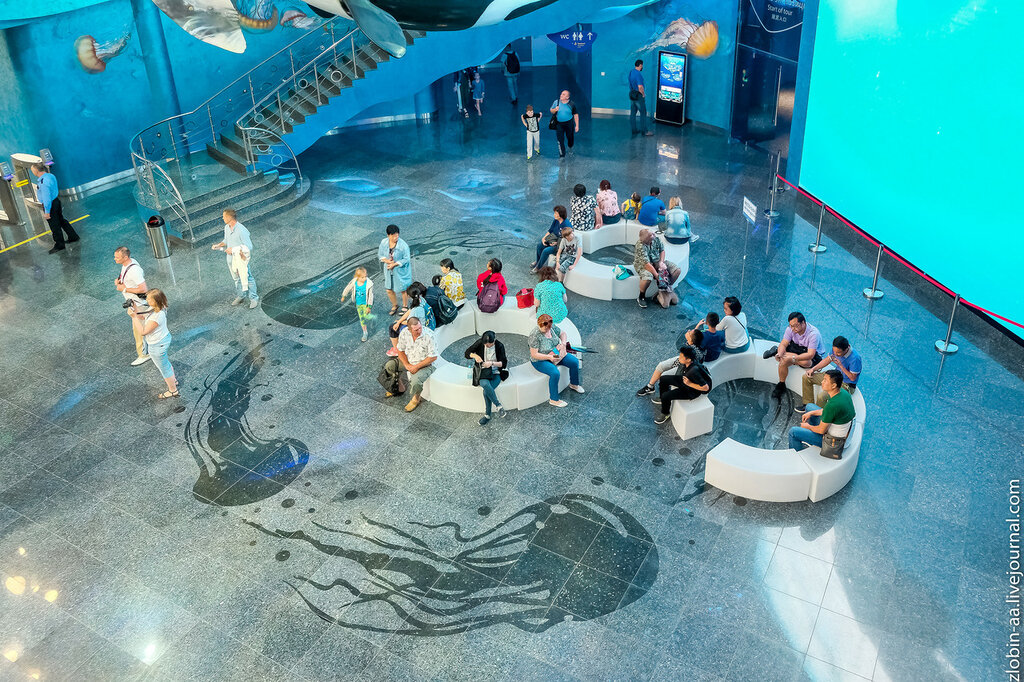 Так... В первой части всем известного балета я рассказывал о дельфинарии Приморского океанариума и дельфиньем же перформансе, а сегодня я вам расскажу о более образовательной части экспозиции. Чем хорош русский человек? Русский человек всегда сообразит, как из ничего сделать кое-что. Например, научная экспедиция - долго и дорого. Вжух! И под крышей океанариума разместили 5 научно-исследовательских, 2 производственные и 2 ученические лаборатории, что позволяет заниматься фундаментальными исследованиями, прикладной наукой и образовательной деятельностью, изучая представителей всех океанов и климатических зон планеты. Девять постоянных экспозиций включают в себя 135 аквариумов объемом 15.000 кубометров, а всякая новая животная проходит обязатлеьный карантин в научно-адаптационном корпусе учреждения...