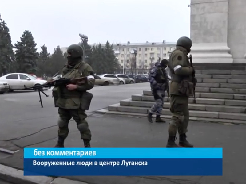 Люди в военной форме без знаков отличия и принадлежности к тем или иным организациям, вооруженные стрелковым оружием и минометами, захватили административные здания в центре города. Об этом говорилось в сюжете ГТРК ЛНР и это подтвердили источники "Новой газеты" и затем другие СМИ, работающие в регионе.