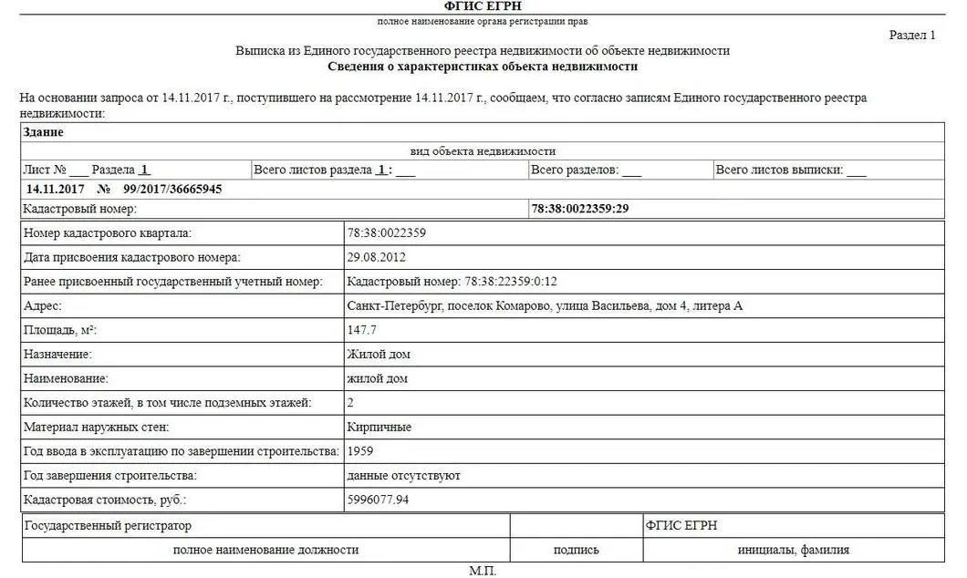 В-третьих, если ввести в Единый государственный реестр недвижимости кадастровый номер «объекта недвижимости», указанный в ответе прокуратуры, «выскочит» запись о жилом доме площадью 147,7 кв. м, введенном в эксплуатацию в 1959 году.