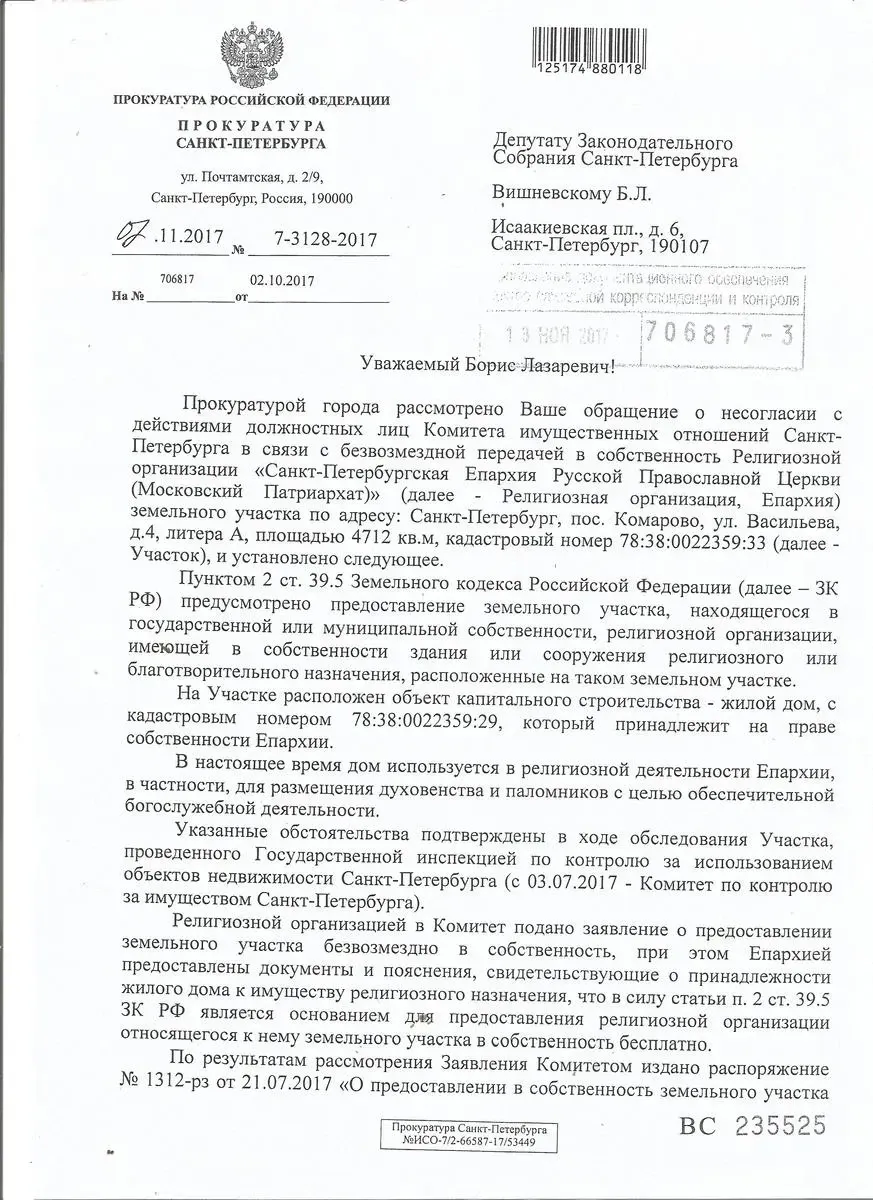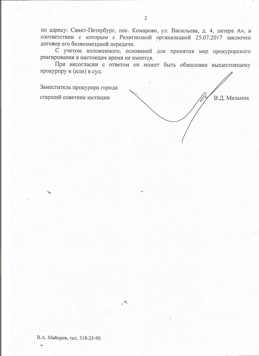Я написал в прокуратуру города, требуя оспорить распоряжение Смольного о дарении РПЦ этого участка и отменить его. И получил отказ: мне сообщили, что по результатам проведенного обследования участка, выяснено, что дом «используется для размещения духовенства и паломников» и что епархия «представила документы и пояснения, свидетельствующие о принадлежности жилого дома к имуществу религиозного назначения».