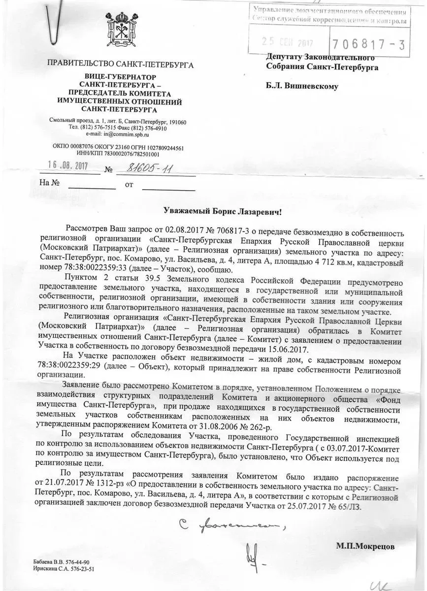 Подарок показался мне не только слишком дорогим, но и незаконным: дача не относится к религиозному имуществу. Может быть, там есть еще что-то? Смольный ответил — нет, ничего больше нет: в письме вице-губернатора Михаила Мокрецова, которое я получил в ответ на свой депутатский запрос, констатируется, что на земельном участке располагается единственный объект недвижимости — жилой дом, принадлежащий «указанной религиозной организации» (епархии). И что здание «используется в религиозных целях».