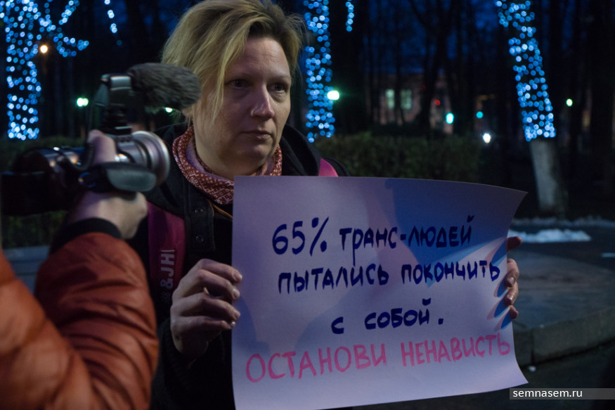 Во время пререканий Александры Яшаркиной с противниками акции один из них указал на девушку, стоявшую в толпе рядом с ним. Раздались крики: «Она — парень, *** буду!». Девушка подтвердила, что она трансгендер, и представилась Анной. Молодые люди стали спрашивать, что у нее «между ног», какие отношения с родителями, работает ли она.