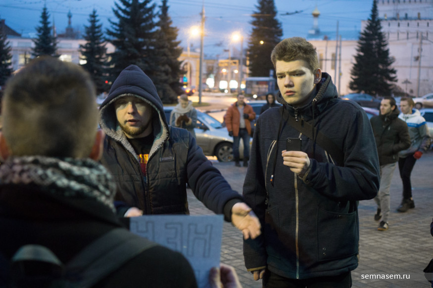 — Мы пришли просто из общественной солидарности. У нас есть претензии к этому собранию. Собираются именно меньшинства, которые хотят что-то высказать на всеобщее обозрение, это смущает. Они же в интернете написали, кто именно собирается [ЛГБТ]. Если, допустим, алкоголики, наркоманы, бывшие заключенные собираются, чтобы протестовать против повышения цен на бензин, они же не говорят, кто они. А тут люди подчеркивают, кто они. Вот, например, лесбиянки. Я считаю, это неправильно. Тут из нас присутствуют люди разных движений — «Трезвый Ярославль», например. Все неравнодушные. Я не говорю, что мы пришли разогнать или что. Надо и им тоже сказать, что нельзя так приходить и заявлять, что мы вот, извините меня, пидорасы, будем делать тусовку против насилия. Младшее поколение будет им задавать вопросы, кто они? — рассказал корреспонденту «7x7» молодой человек, который представился Максимом.