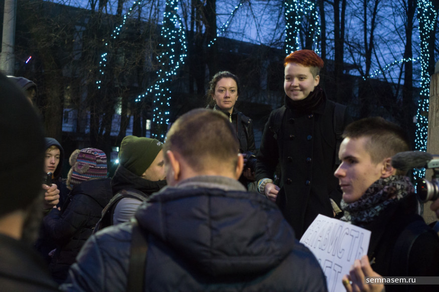 Пока молодые люди приставали с расспросами к пикетчикам, их «отбивала» активистка Александра Яшаркина. Ей тоже задали несколько: «Сколько тебе лет? Наверное, пятьдесят? Ты кого любишь, мальчиков или девочек?».