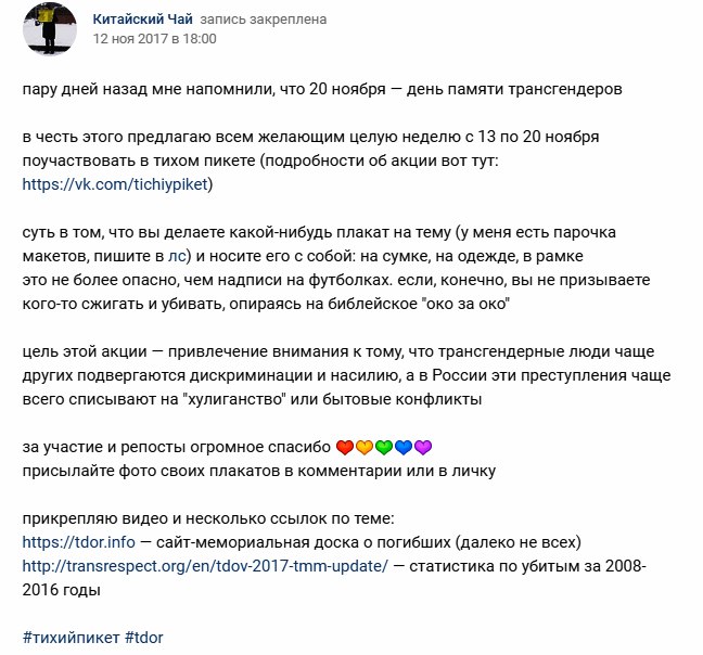 Когда Алёна напомнила мне про День памяти трансгендеров, в моей голове сразу пронеслось: тихий пикет. А уже через неделю я пишу пост на своей странице Вконтакте. Это было экспериментом как для меня, так и для Сыктывкара, мне кажется. Если вкратце, суть тихого пикета в том, что человек не кричит о проблеме и не тычет в лицо всем прохожим каким-либо плакатом, а просто носит его с собой с готовностью ответить на вопросы. Плюс ко всему, информация должна быть проверенной.