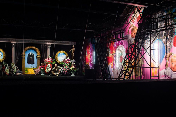 © Олимпия Орлова / Электротеатр Станиславский Главный текст — рассказ «Жених» Юрия Мамлеева, мы его не слышим, а только видим. Он идет комиксными видеоподписями, дополненный километрами рисованных комментариев и до боли знакомых артефактов русской жизни — от косолапых мишек до похоронных венков.