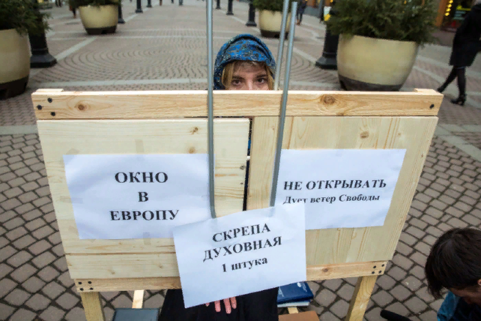 На Малой Садовой активисты Весны в духе сказок Роу закрыли сегодня «окно в Европу», чтобы из него не дул «ветер свободы», протестуя против закрытия Европейского университета pic.twitter.com/ZzdFcjGry8