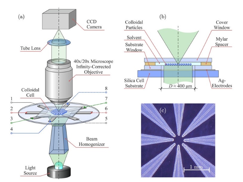 Разработанная установка состоит из экспериментальной ячейки, системы электродов, расположенных вокруг нее, и оптического блока. В ячейку помещается коллоид (жидкость с нерастворимыми в ней микрочастицами), электроды создают управляющее электрическое поле, а оптический блок служит для визуализации и видеозаписи движения частиц. Самосборку частиц в кластеры и фазовые переходы в них можно наблюдать в режиме реального времени.