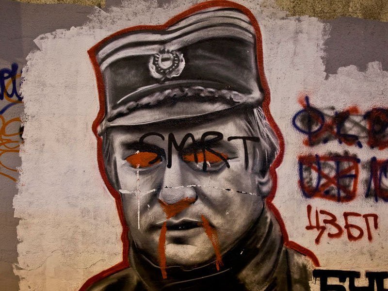 Настенная роспись. Ратко Младич Ратко Младич, один из командующих армии Республики Сербской во время гражданской войны в Боснии в 1992-1995 гг., приговорен Международным трибуналом по бывшей Югославии (МТБЮ, известен также как Гаагский трибунал, по месту нахождения) к пожизненному заключению за геноцид, преступления против человечности и нарушения законов и обычаев ведения войны. В частности, Младич признан виновным в убийстве 8 тысяч мусульман в Сребренице в 1995 году и организации 43-месячной осады города Сараево, в результате которой от обстрелов погибли до 11 тысяч мирных жителей. В целом было выдвинуто обвинение по 11 пунктам.