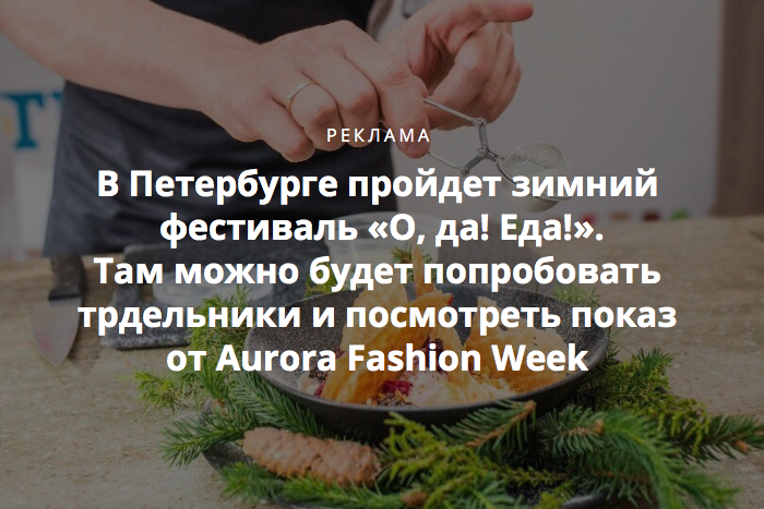 В Петербурге c 25 по 26 ноября в ТРЦ «Охта Молл» пройдет зимний фестиваль «О, да! Еда! Встречает зиму»: более 30 ресторанных проектов Петербурга представят свое новое зимнее меню.