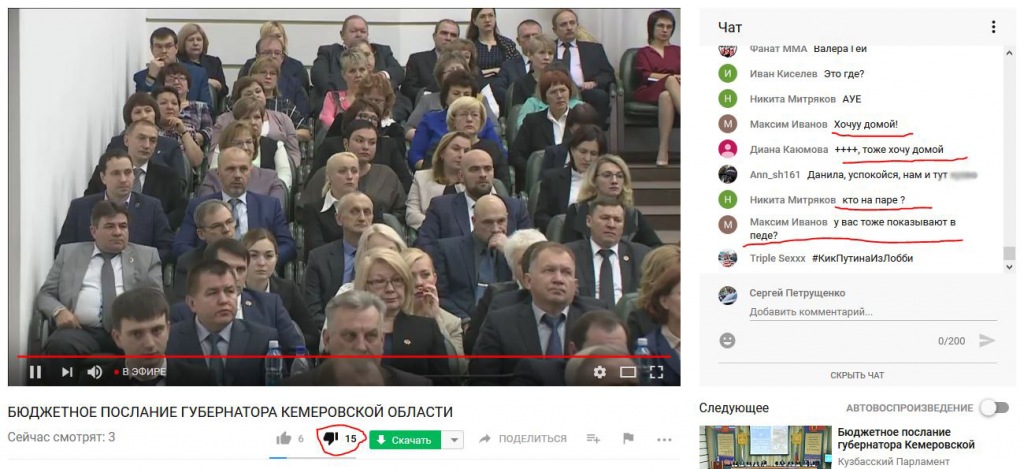 Добавим, что трансляция послания шла в колледжах и вузах региона в качестве занятий. Через 15 минут после начала выступления к трансляции на сайте youtube.com отключили комментарии, но пользователь твиттера nissanych успел сделать вот такой скриншот.