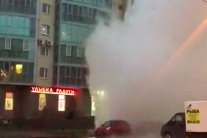 В комментариях к посту сообщают, что поток кипятка побил находившиеся рядом машины. Уточняется, что трубу прорвало у дома 23 на Варшавской улице.
