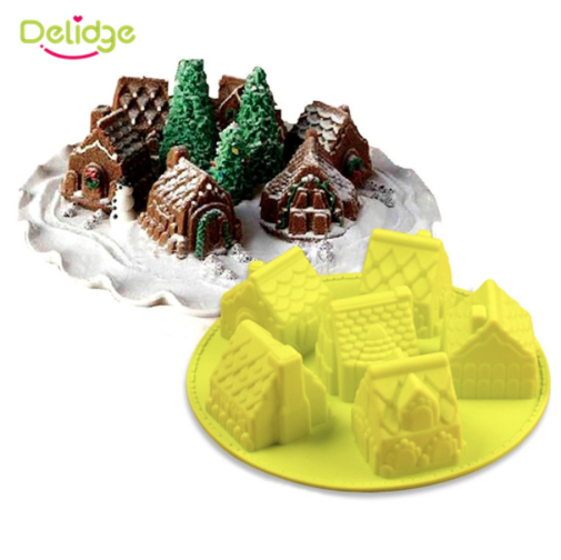 Еще одно приспособление для выпечки: можно сделать шесть кексов в форме домов из рождественской деревни, изобразив снег при помощи сахарной пудры, зефира или взбитых сливок.