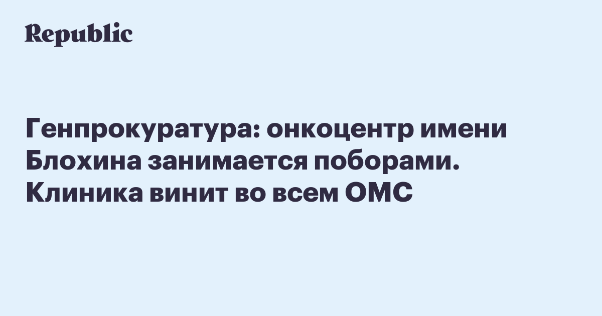 Генеральная прокуратура 23 ноября внесла в Министерство здравоохранения представление в отношении онкологического центра имени Блохина. Ведомство считает, что за последние два года около двух тысяч пациентов платили за услуги, которые обычно оказываются бесплатно. В самой клинике утверждают, что проблема в региональных фондах обязательного медицинского страхования (ФОМС). Republic рассказывает главное о конфликте Генпрокуратуры и центра имени Блохина.