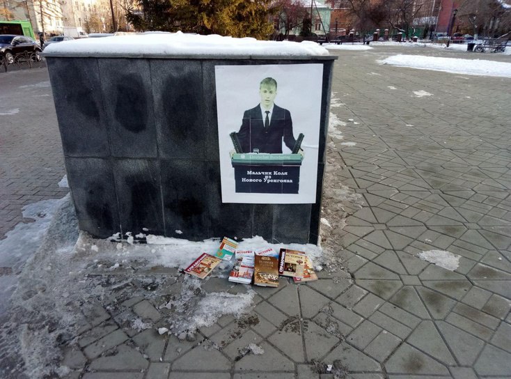 В Тюмени на гранитную плиту памятника учащимся школ, не вернувшимся с войны, повесили плакат с фотографией школьника Николая Десятниченко из Нового Уренгоя. Акция организована группой "Свободный Радикал". Под баннер вместо цветов они положили учебники по истории.