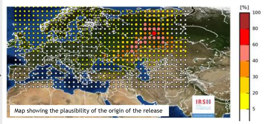 В конце сентября в Европе уровень загрязнения варьировался от нескольких микробеккерелей (мкБк) до 5,5 миллибеккерелей (мБк) на куб. м. Французские эксперты предположили на основе компьютерного моделирования, что радиоактивный выброс произошел где-то на территории России, между Волгой и Уралом, а количество рутения-106 в точке выброса — от 100 до 300 терабеккерелей (ТБк) [1]. Немецкие специалисты считают, что выброс случился где-то на Южном Урале, оговариваясь, впрочем, что это могло случиться и где-то еще на юге России или в Казахстане [2].