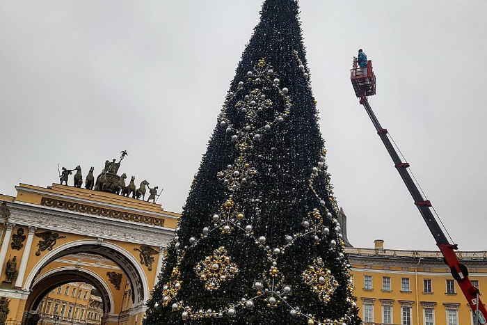 Днем в субботу, 25 ноября, на Дворцовой площади завершили установку главной городской новогодней елки. 25-метровое искусственное дерево собрали за шесть дней: его начали монтировать в понедельник, 20 ноября.