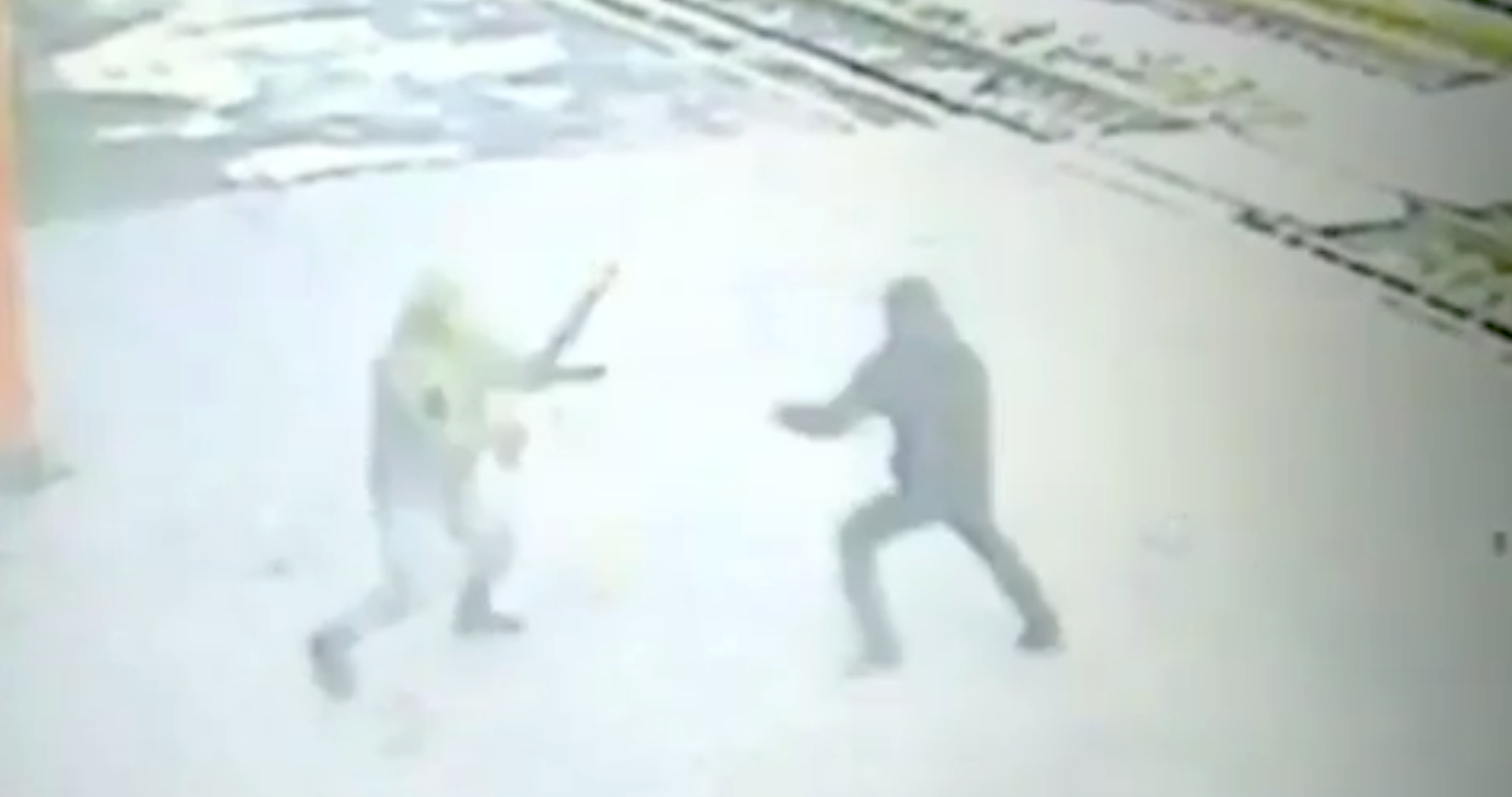На появившемся в соцсети «ВКонтакте» видео с камеры наблюдения видно, как мужчина подходит к двум сотрудникам — в полицейской форме и камуфляже. Он подходит со спины к одетому в форму сотруднику и бьет его в голову, а затем пытается напасть на другого, но тот достает из-за спины автомат и открывает стрельбу. Нападавший падает.