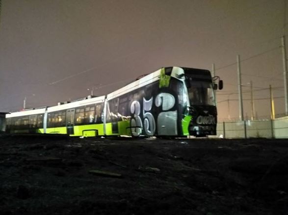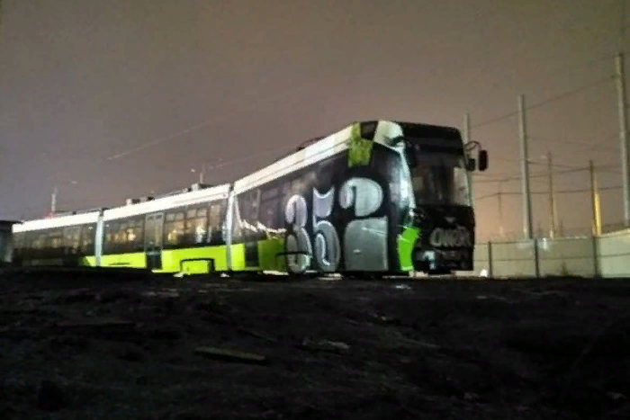 Новый петербургский трамвай «Чижик» изрисовали граффити. Состав стоял в депо и еще ни разу не выезжал в город