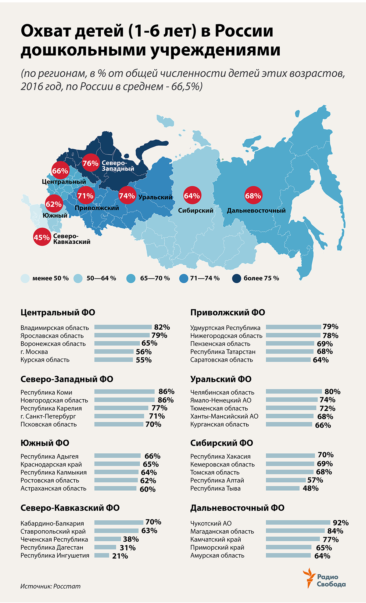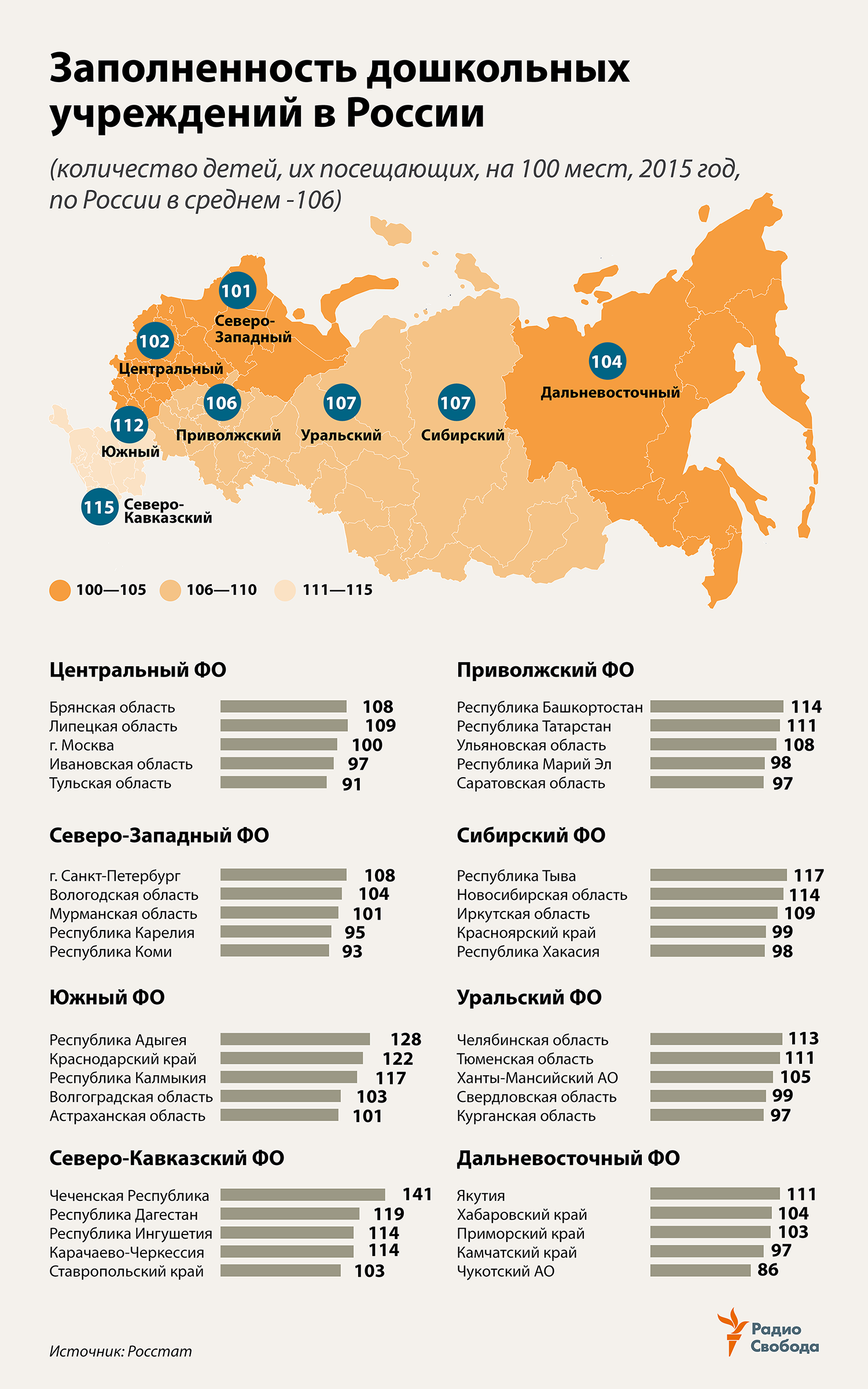 По последним из имеющихся на этот счет данным Росстата за 2015 год, в среднем по России на каждые 100 мест в дошкольных образовательных учреждениях приходилось 106 детей (в возрасте от 1 года до 6 лет), их посещающих (уровень практически не изменился с 2008 года). В трети регионов страны этот показатель был еще выше, и во всех восьми федеральных округах средний показатель превышал 100%.