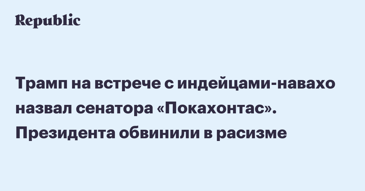 Трамп, обращаясь к навахо, сказал, что это племя индейцев «было здесь задолго до нас». «Хотя у нас есть представитель в Конгрессе, которая, как говорят, была здесь давно. Ее называют Покахонтас», – добавил он. Трое ветеранов-индейцев никак не отреагировали на слова президента.