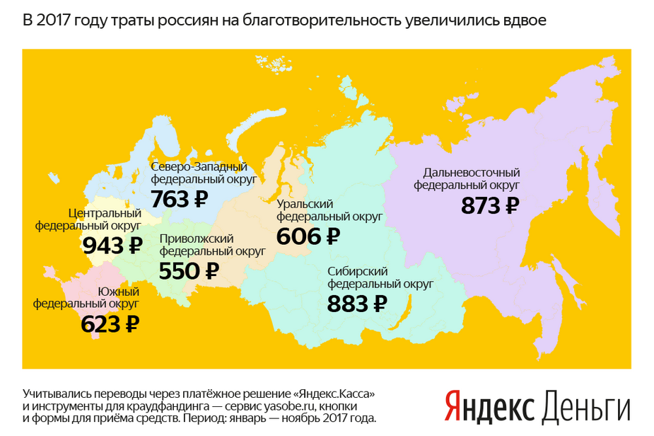 В целом по стране с января по ноябрь 2017 года люди потратили на благотворительность и краудфандинг около 1,2 млрд руб. Это вдвое больше, чем за такой же период годом ранее. Средний перевод россиян на благотворительность и краудфандинг сегодня составляет 722 руб. — на 13% больше, чем год назад. При этом на благотворительность пользователи по-прежнему отправляют больше, чем на краудфандинг, — 965 и 643 руб. соответственно.