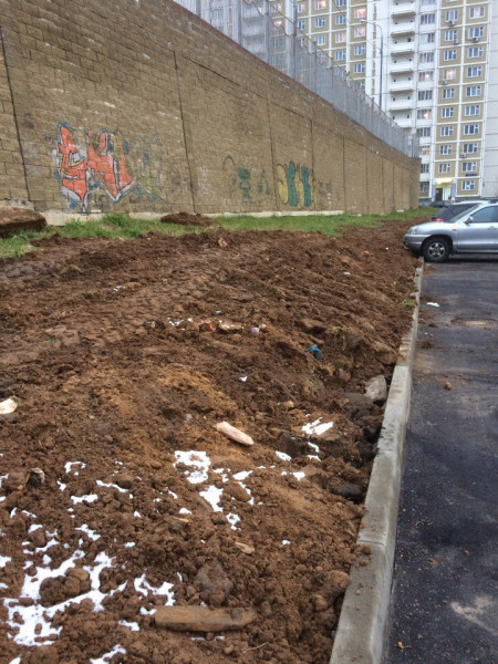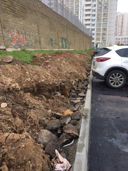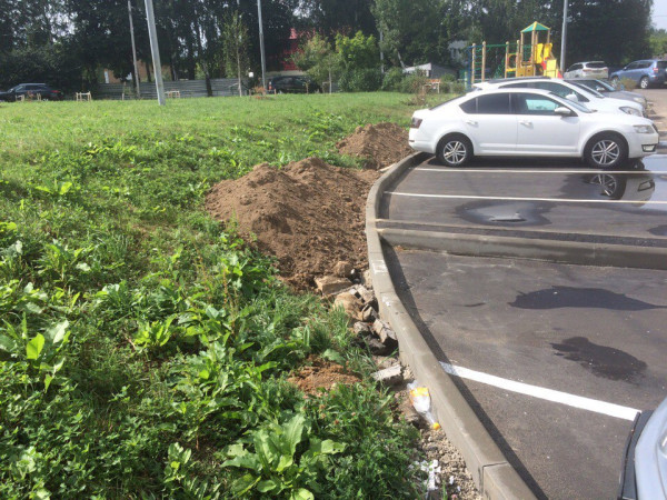 В августе "Жилищник" выполнил здесь устройство парковочных мест. Оставшийся строительный мусор (куски бордюров и асфальта) благополучно закопали в землю.