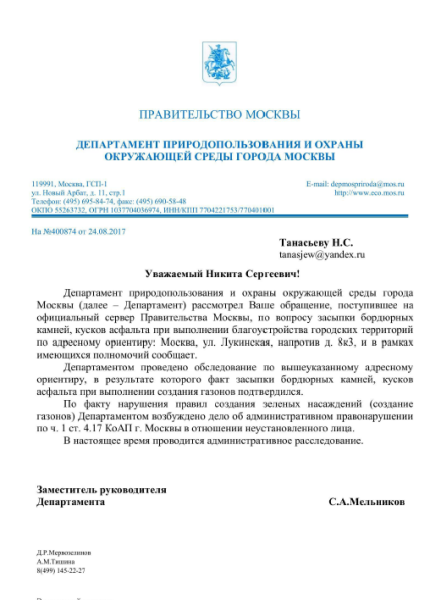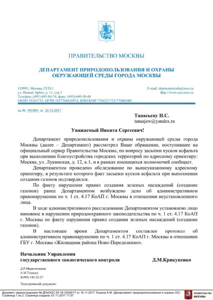 Тут пришёл ответ ДПиООС, который подтвердил факт наличия строительного мусора в ранее спланированном (разровненном) грунте.