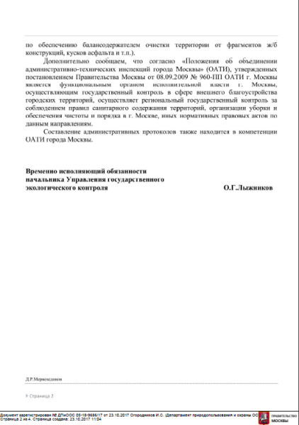 Инспекция в первый раз мне сообщили, что всё хорошо, я опровергаю. Во второй раз Главный инспектор УКОН по ЗАО Шибаев М.В. провёл контрольное обследование, сообщив, что всё "Ок".