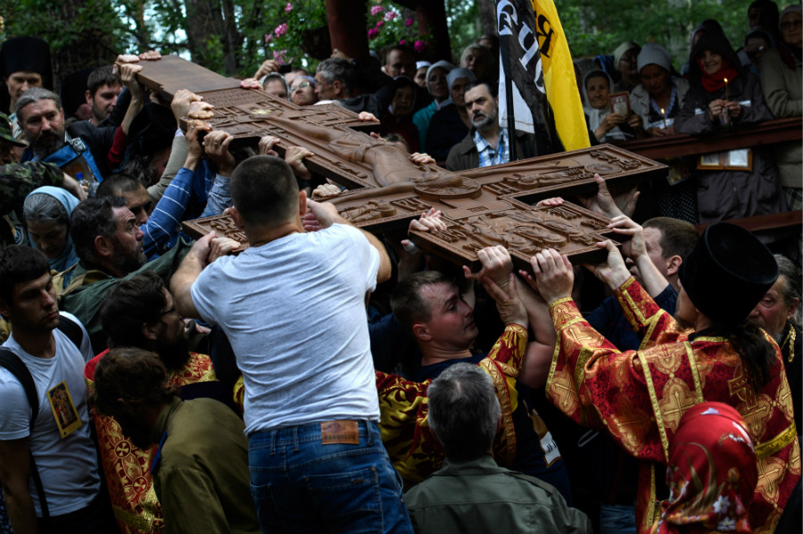 Верующие во время крестного хода в память о последнем российском императоре Николае II и его семье от Храма-на-Крови в Екатеринбурге до монастыря Святых Царственных Страстотерпцев в урочище Ганина яма в Свердловской области. Шествие состоялось в рамках международного фестиваля православной культуры «Царские дни»Фото: Донат Сорокин/ТАСС Отрицание подлинности останков прочно соединилось с культом царской семьи далеко за пределами царебожнических общин. Расхожее мнение, в том числе среди священников и епископов: «Церковь останки не признала и признать не может. Точка». Странным образом желанию обрести мощи святых для поклонения верующие предпочитают иллюзию бестелесности, полного материального отсутствия страстотерпцев на Земле. Возможно, это ассоциации с отсутствием мощей Христа, вознесшегося на небо в воскресшем теле, и Богородицы.