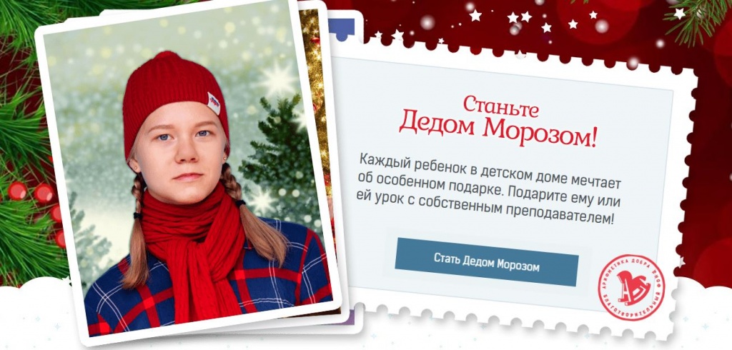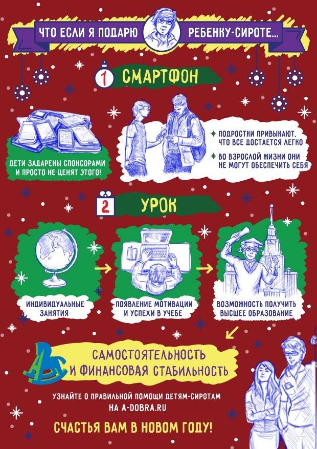 Благотворительный фонд «Арифметика добра» запустил новогоднюю фандрайзинговую акцию под названием «Станьте Дедом Морозом для детей-сирот» и инфографику для социальных сетей. Сотрудники фонда создали целевую страницу с анимацией, на которой пользователям предлагают пожертвовать на образовательную программу фонда.