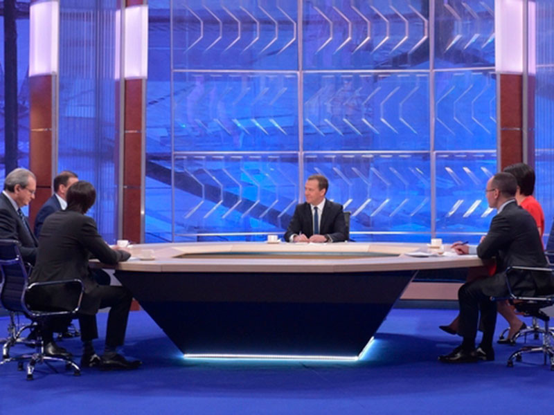 "Разговор с Дмитрием Медведевым" стартовал в полдень по московскому времени, его транслировали в прямом эфире телеканалы "Россия 1", "Россия 24", "Россия HD", радио "Вести FM" и интернет-портал "Вести.ру".