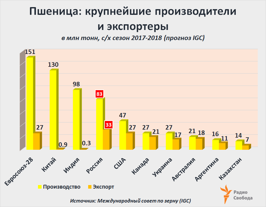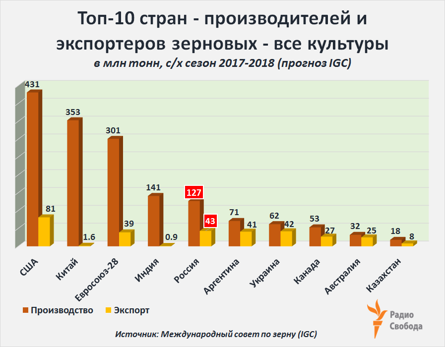 Source: сайт правительства России ДА, НО... Россия действительно стала крупнейшим экспортером пшеницы, однако по общему ее производству отстает от лидеров в 1,5-2 разаПо словам председателя правительства, в 2017 году урожай зерновых в России составил 140 млн тонн – “такого результата страна никогда не знала”. Всего двумя днями раньше министр сельского хозяйства РФ отмечал, что “что общий сбор зерновых составил более 130 млн тонн”. Если премьер, скорее всего, имел в виду урожай в так называемом “бункерном весе”, то есть до очистки и сушки, то министр, очевидно, – урожай уже в “чистом весе”. Эту “понижающую” величину в конце сентября, когда зерновые были убраны с 81% засеянных площадей, в Минсельхозе оценивали в 6%.