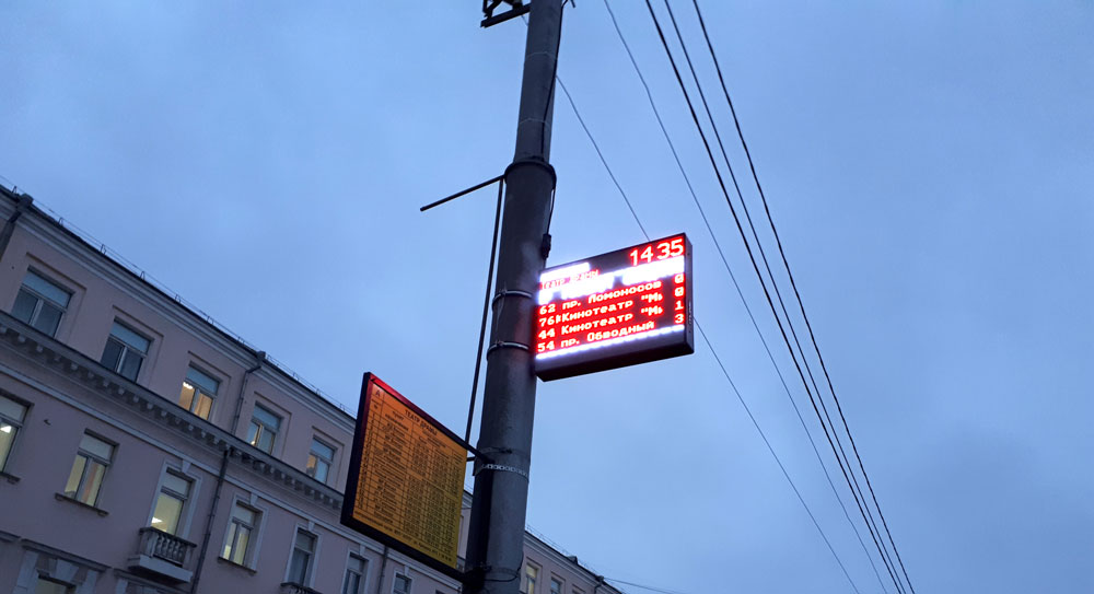 И всё бы хорошо. Но исполнение ужасное. Табло маленькое, информации одновременно влезает немного. Плюс ещё и повесили высоко. Очень высоко, выше желтых таблички со списком автобусов. Я думал последняя — пример максимального удаления информации от глаз людей. Но нет, новый рекорд взят.