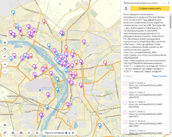 Омский активист Виктор Корб не поверил чиновникам на слово и организовал общественное расследование. Он объявил в Twitter о самостоятельном массовом мониторинге появления в воздухе этилмеркаптана. Идея была такая: внимательные жители сообщают ему о времени, месте и степени едкого запаха (по пятибалльной шкале), эти данные фиксируются на карте и, учитывая направление и силу ветра, определяется источник.