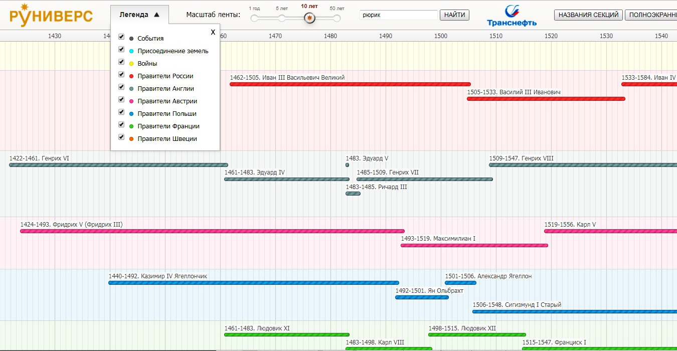 Лента времени "Руниверс" Сейчас на «Ленте времени» представлены события российской истории с 1430 по 1917 год и правители крупных европейских держав этого же периода. Этот базовый событийный ряд разделен по следующим тематическим разделам: присоединение земель, войны, правители России, Англии, Австрии, Польши, Франции, Швеции. Все события снабжены небольшими аннотациями, которые подготовлены научными консультантами Руниверса. В дальнейшем в эти аннотации будут добавлены ссылки на материалы библиотеки и Русской энциклопедии Руниверса.