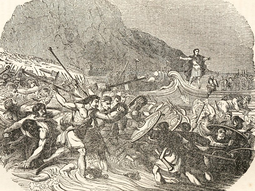 Римлянам пришлось пустить в ход метательные машины, установленные на некоторых корабля, а также начать стрельбу из луков и пращей, чтобы прикрыть десантирующихся легионеров. Орлоносец X легиона воскликнул: «Прыгайте, солдаты, если не хотите предать орла врагам; а я во всяком случае исполню свой долг перед республикой и императором». Затем он храбро спрыгнул с корабля в волны и ринулся в атаку, увлекая за собой солдат. Этот эпизод позже полюбили изображать иллюстраторы английских учебников истории.