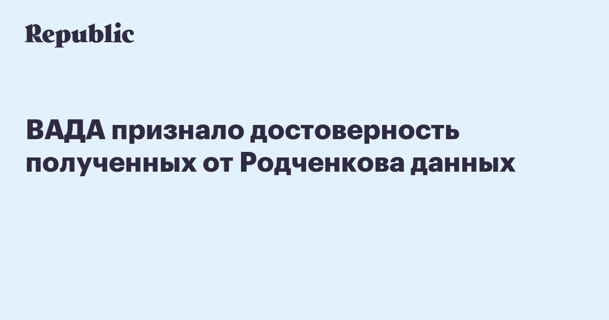 Всемирное антидопинговое агентство (ВАДА) подтвердило подлинность информации, полученной от своего информатора, бывшего директора Московской антидопинговой лаборатории Григория Родченкова. Об этом сообщает немецкий телеканал ARD, на котором ранее выходило несколько фильмов о допинге в России.