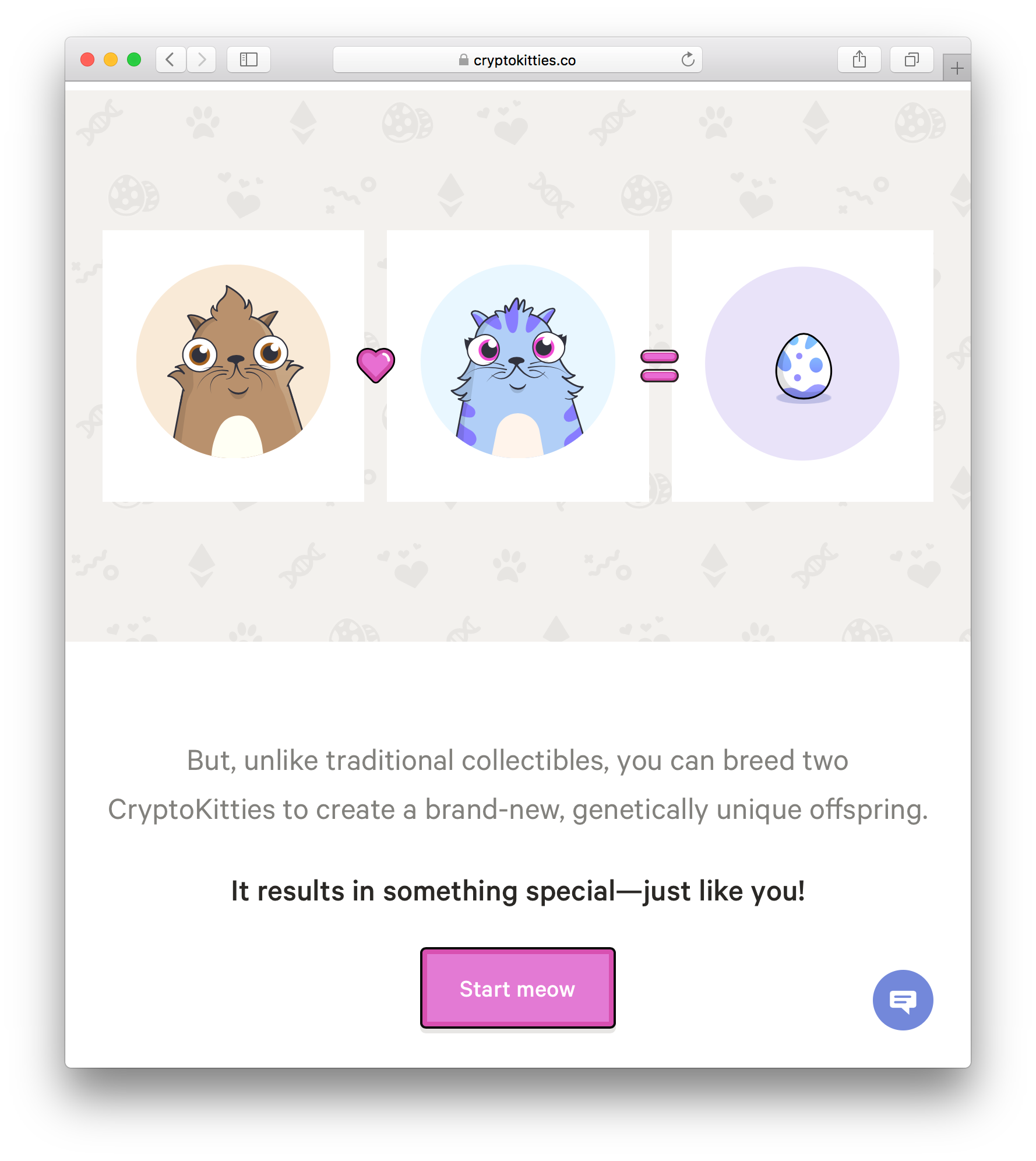 Канадская компания Axiom Zen запустила игру CryptoKitties 28 ноября. Все, что требуется от игрока, — купить одного или нескольких виртуальных котов. Остальное на его усмотрение: игрок может хранить кота как коллекционный предмет; может продать его; а может свести животных и получить потомство.