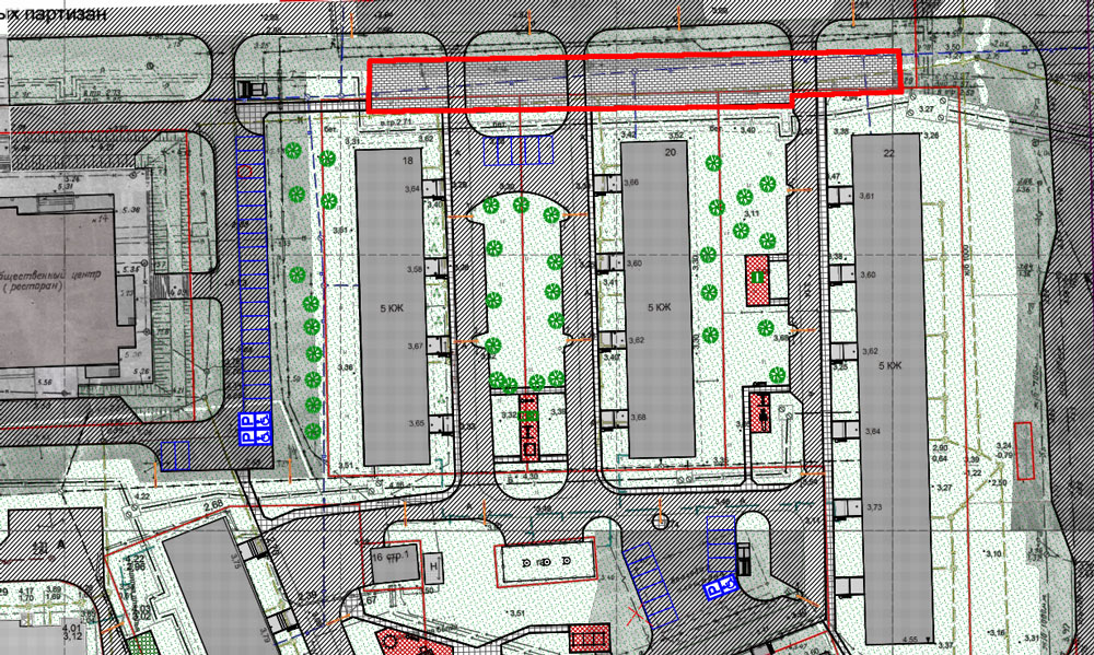 Давайте проверим, что там у нас нового? А вот, новая пешеходная зона вдоль домов по ул. Красных партизан №№ 18, 20, 22. Вот план с сайта администрации города, красным обвел пешеходную зону. Парковочных мест на ней нет (они на плане синим):