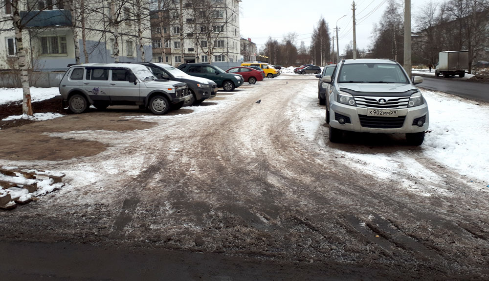 Уже старая история. Писал не раз. На площади Терехина в Соломбале, напротив магазина Магнит стерся бордюрный камень. Тротуар находится на уровне проезжей части. Машины паркуются, мешая пешеходам, а поток людей значительный (магазины, остановка, путь к светофору). ГИБДД штрафовать не может — нельзя визуально установить границы проезжей части. Смотрите заглавное фото.
